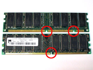 位于上面的那片内存条就是我们现在使用的SDRAM,而下面一片就是大家只闻其名未谋其面的DDRAM内存条。从外观上,DDRAM内存条区别于SDRAM明显的特点是:DDRAM内存条的金手指部分只有一个缺口(已用红圈标注),而SDRAM内存条则有两个缺口。 另外,从外观上,我们还能比较出:DDRAM内存条的金手指比SDRAM多。确实,DDR是184 PIN的,而现在的SDRAM内存条是168 PIN的。 下面就是DDR内存条的放大图: