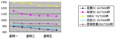 由于逐渐有一些新货进入市场,本周硬盘价格是稳中有降,特别是倍受欢迎的IBM 75GXP 30.7G硬盘,已经从上周的1340元滑落到现在的1230元,降幅居然有110元,需要买硬盘的读者朋友可以考虑出手了。不但IBM硬盘降价,市面上主流的硬盘基本上都有20-40元的跌幅,朋友们可以参考一下下面的价格曲线:
