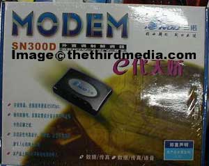 哦,三诺,不是做音箱的厂商吗,怎么也开始趟起MODEM这片混水来了...立刻去看货,没想到,这款MODEM是塑封的,所以其庐山真面目具体是什么样,笔者也没能见到,不过商家说里面的东西和包装上面的图片一模一样,(见图)没办法,只好听听这款MODEM的具体性能指标了。